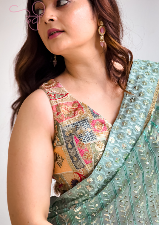 Sage Green Multi-Color Embroidered Blouse – Unique Designer Craftsmanship