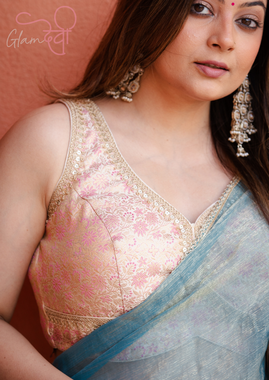 Gold Sleeveless Silk Brocade Blouse with Pink Floral Weave & Deep Back – Festive Wear | Glam Devi