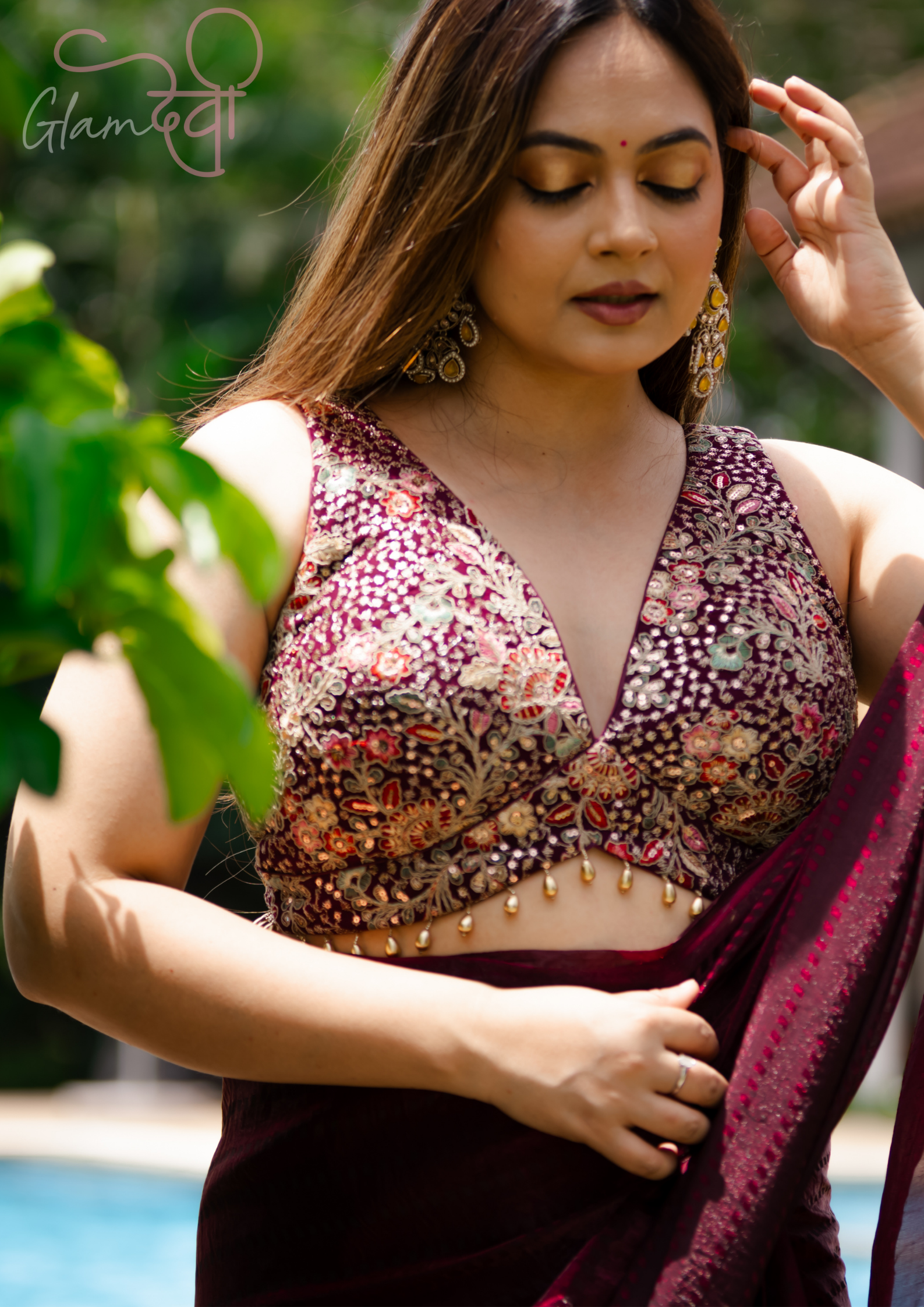 Designer Wine Blouse with Multi-Color Embroidery – Sleeveless Ethnic Wear